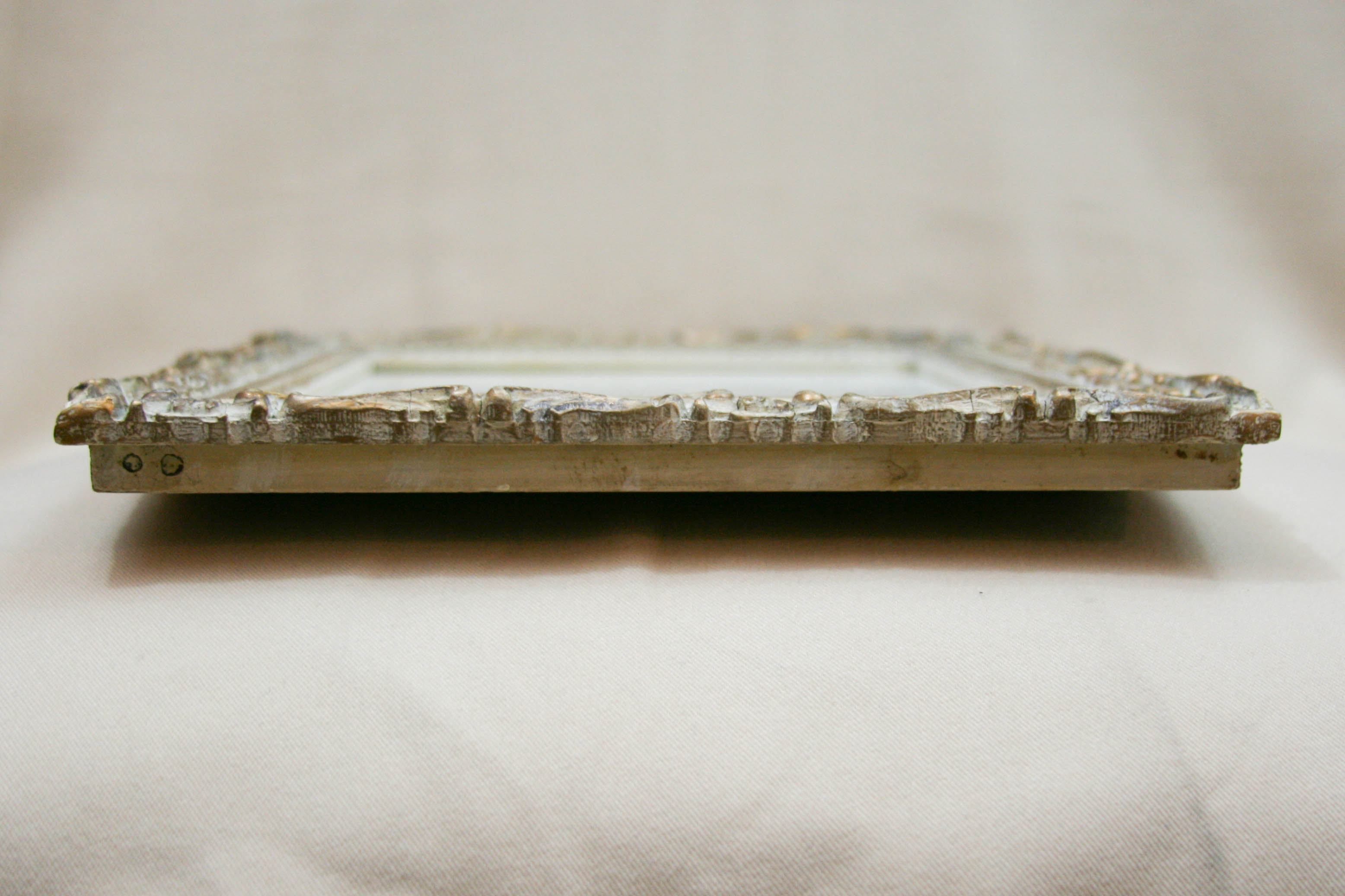 Cadre en bois et résine blanc cassé restauré. Ornements patinés couleur or. Cadre agrémenté d’une ancienne photo de mariés.