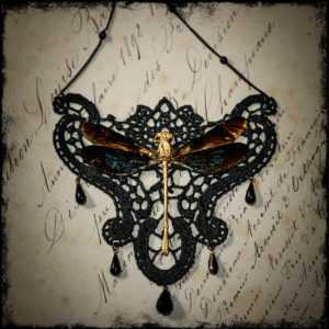Hippocampe en résine, réplique d’un véritable spécimen, doré à la feuille d’or jaune 22,5 carats et patiné; fixé sur de la dentelle noire rigidifiée. Perles « gouttes » noires en verre de bohème.