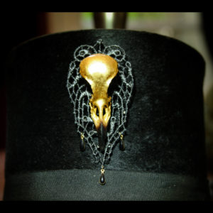 Véritable crâne de Mandarin solidifié, doré à la feuille d’or jaune 22,5 carats et orné de dentelle noire.