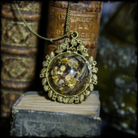 Pendentif rond en résine sur base de camé en cuivre enfermant une aile de papillon et des fragments de feuilles d’or jaune 22,5 carats.