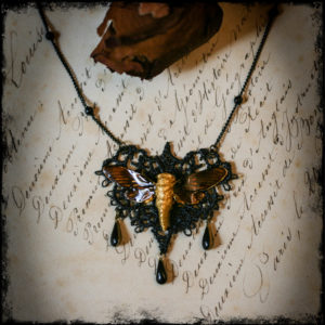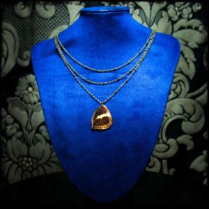 Pendentif rond en résine sur base de camé en cuivre enfermant une aile de papillon et des fragments de feuilles d’or jaune 22,5 carats.