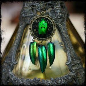 Pendentif rond en résine sur base de camé en cuivre enfermant une aile de papillon et des fragments de feuilles d’or jaune 22,5 carats.