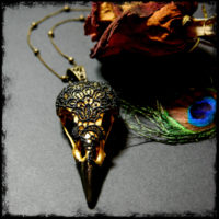 Véritable crâne de pie solidifié, doré à la feuille d’or jaune 22,5 carats et recouvert de dentelle noire.
