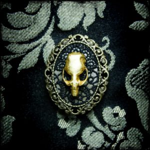 Véritable crâne de pie solidifié, doré à la feuille d’or jaune 22,5 carats et recouvert de dentelle noire.